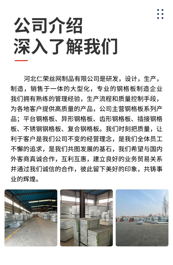 我公司是研发,设计,生产,制造,销售于一体的大型化,专业的钢格板制造企业,我们拥有熟练的管理经验,生产流程和质量控制手段,为各地客户提供高质量的产品,公司主营钢格板系列产品:平台钢格板、异形钢格板、齿形钢格板、插接钢格板、不锈钢钢格板、复合钢格板。我们时刻把质量,让利于客户是我们公司不变的经营理念, ...