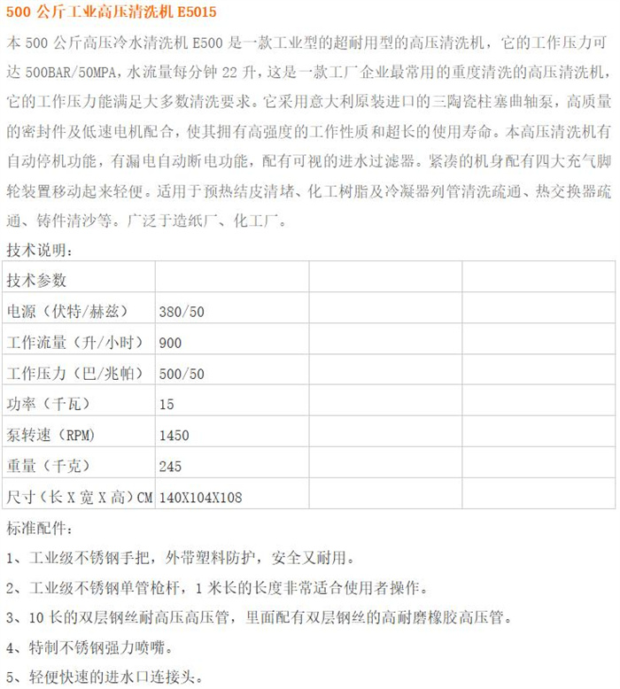 我公司致力于高压水清洗设备的销售及各种售后维修服务,同时为客户提供各种合理有效的清洗方案,公司将尽力为客户提供优良的服务。本公司的主要产品为各种参数的工业高压清洗机,同时还提供专门应对油污的高压热水清洗机。产品广泛应用于汽车制造业零部件加工业、食品加工业、化工厂、水泥厂、矿产加工业、建设工地、市政工程、环卫部门、酒店宾馆及物业超市等行业。