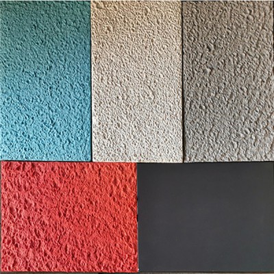 颜 色:色泽丰富,请阅读色卡。由于防火乳液和吸音纤维特有的性能,调颜色方面只能5到6成接近色卡,无法像普通涂料乳胶漆调色那么标准。如果某些工程对颜色要求一致性非常严格,先喷吸音涂料,24小时后,在表面再喷涂二层同颜色的吸音乳胶漆,这样一般都可以达到颜色一致要求,但是会少量影响吸音效果,所以一般建议不要再喷面漆罩色;(提示:由于表面凹凸不平,不同角度,不同光线看,颜色会略有差别);如果需要接近相对平面效果,请用平嘴枪嘴,直着喷,不要倾斜,喷涂之后,根据需求,可以用刮涂工具,刮平一下,需要技巧。如果需要凹凸感比较强,一般倾斜45度角来喷涂,调整风力,灵活掌握,根据现场情况。