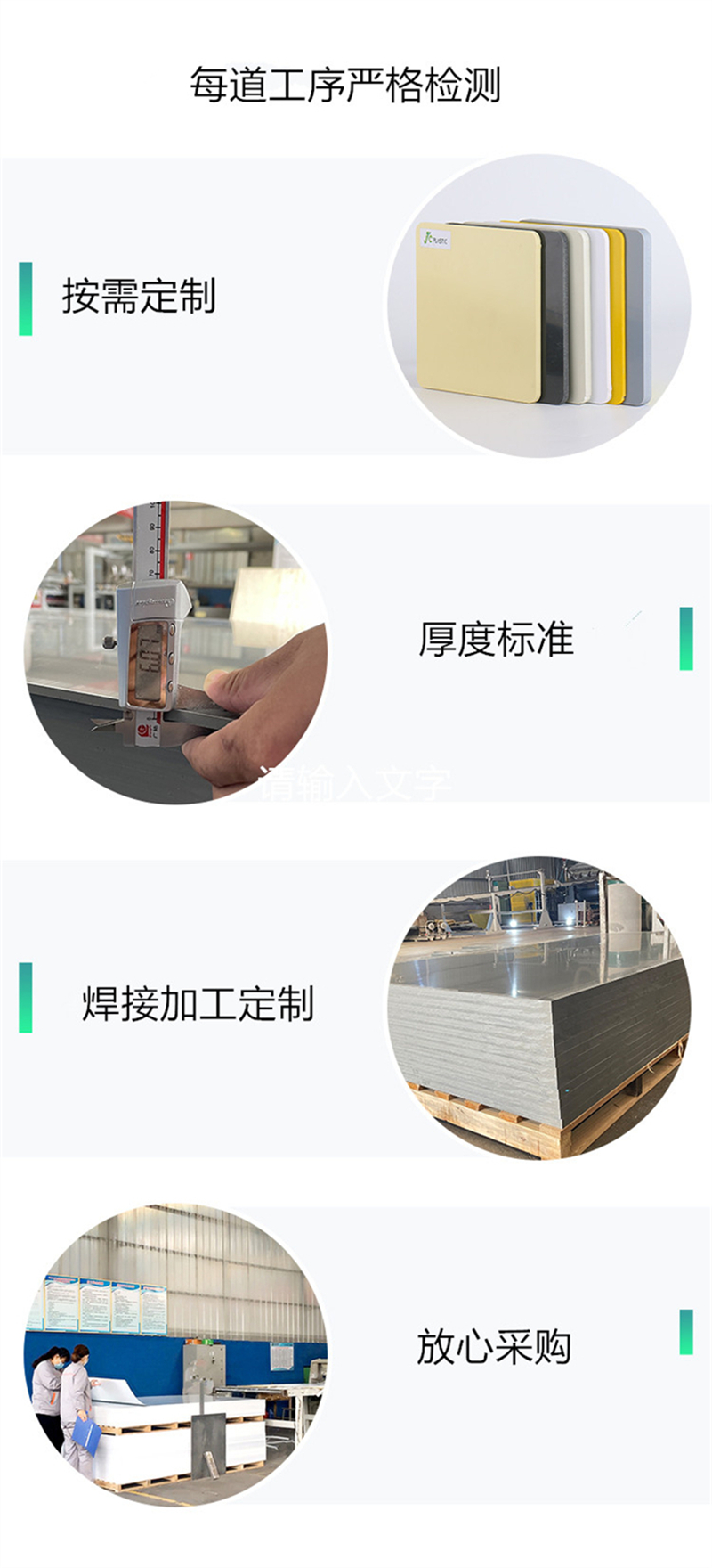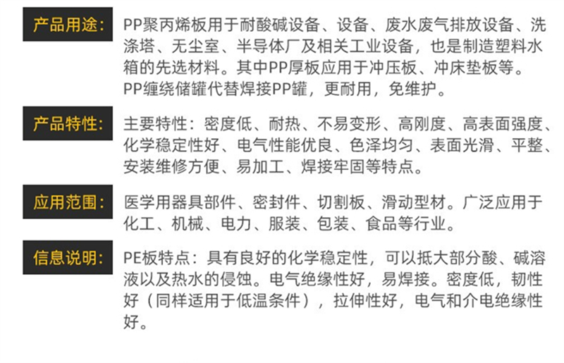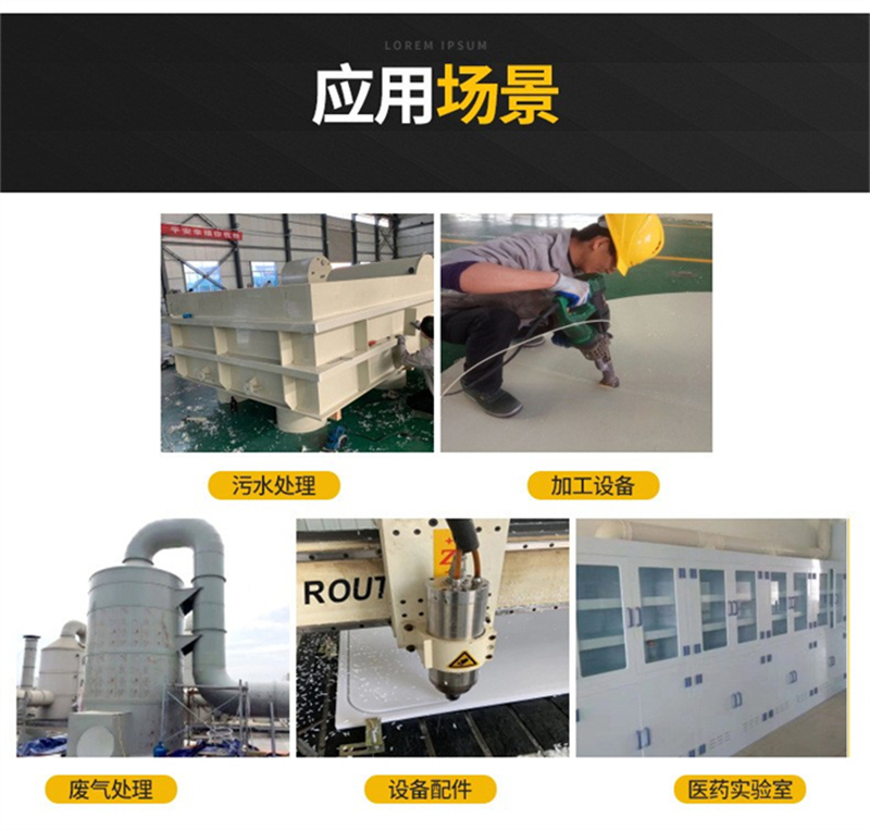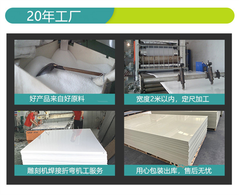 我公司拥有板材生产线,年生产能力强,公司主要产品为工程塑料,有PVC硬板、软板、透明板, PP板材、PPH板材、PE板、CPVC板、PPH缠绕罐、HDPE缠绕罐以及各种塑料焊条,并承接各种塑料焊接工程,公司配备大型雕刻机,为客户提供一条龙加工服务。其中PVC挤出厚板厚度可达60mm,工程板宽度可达2米。产品广泛应用于环保设备、化工、石油、电镀、矿山、电子、建筑、稀有金属和稀土萃取、食品、 航天以及广告印刷等多种行业。产品销售已覆盖全国各地。
